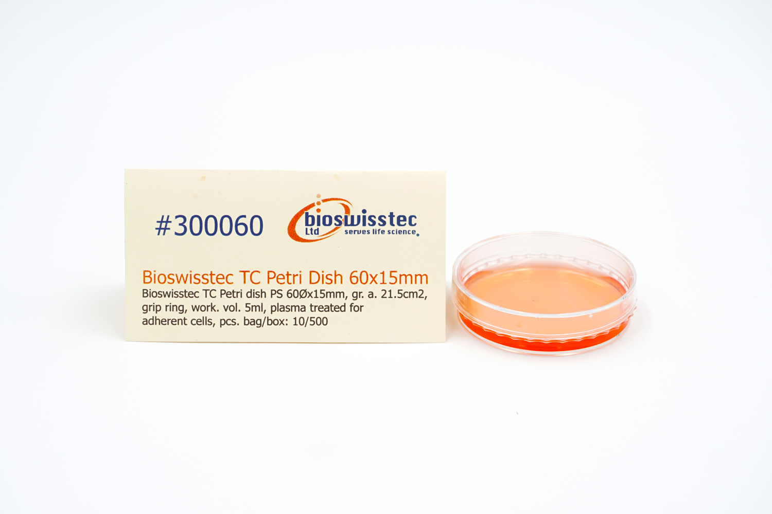 TC Petri dish PS 60Øx15mm, gr. a. 21.5cm2, grip ring, work. vol. 5ml, plasma treated for adherent cells, pcs. bag/box: 10/500
