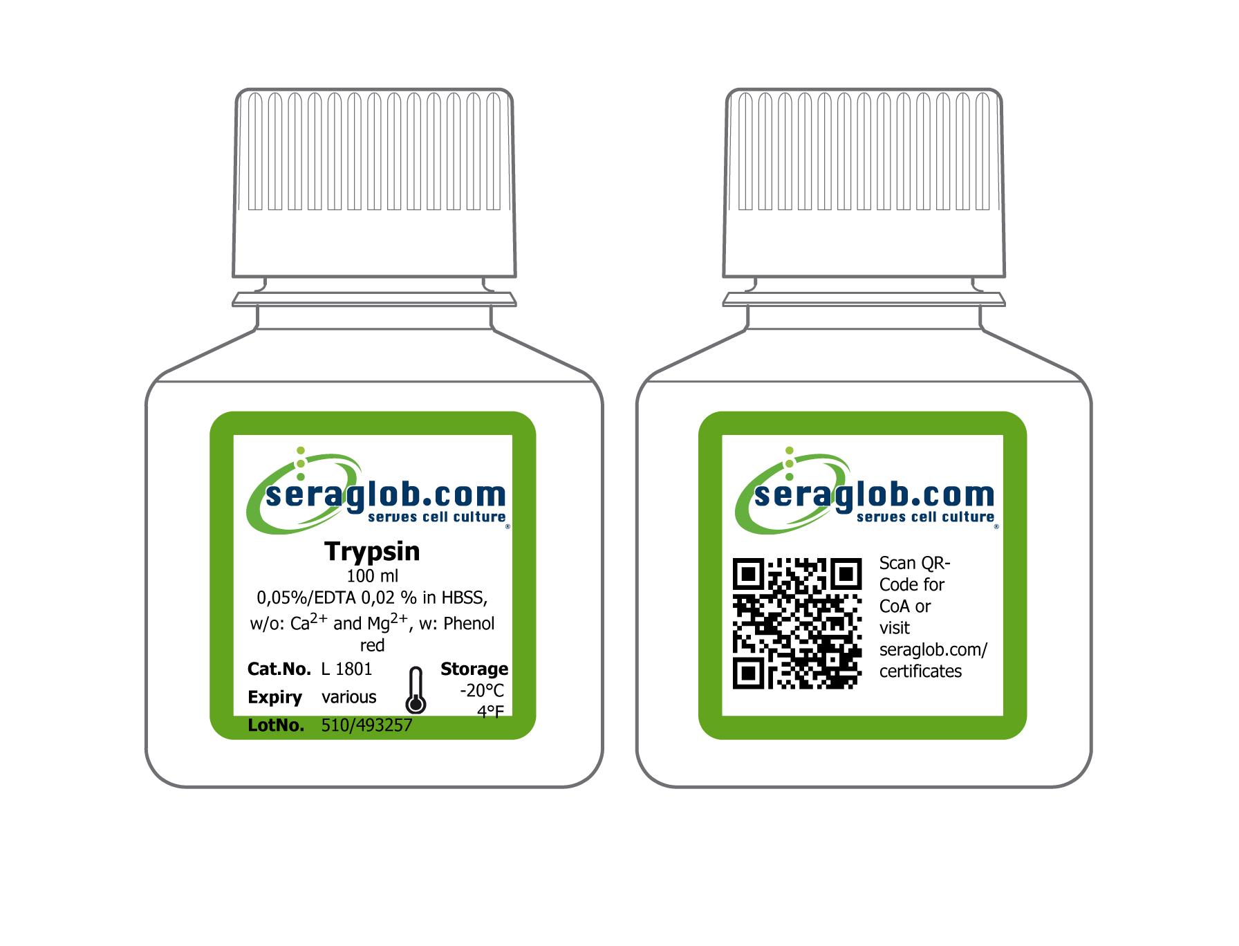 Trypsin 0,05 %/EDTA 0,02 % in HBSS, w/o: Ca2 and Mg2 , w: Phenol red, single unit of 100 ml, storage at -20°C