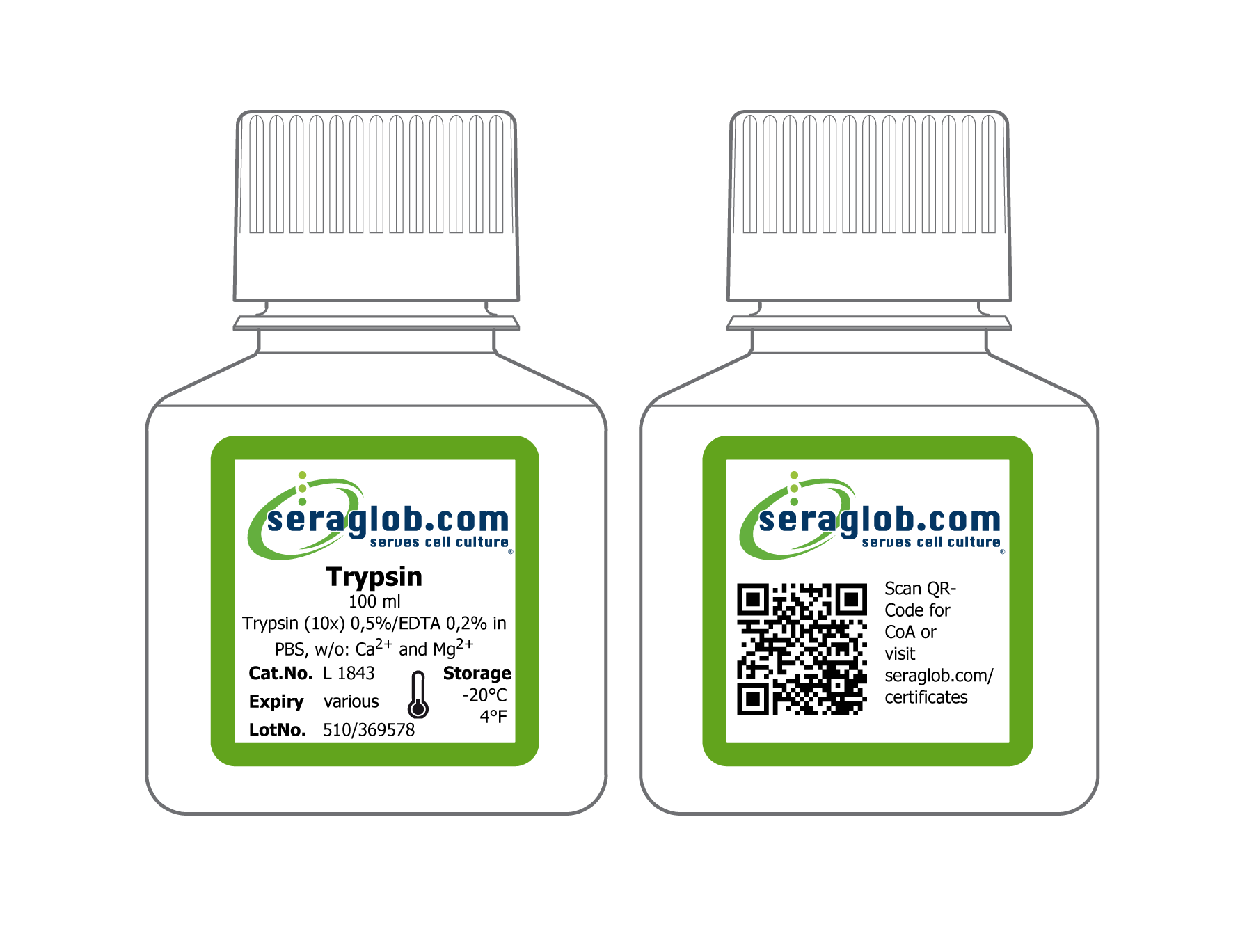 Trypsin (10x) 0,5%/EDTA 0,2% in PBS, w/o: Ca2 and Mg2 , single unit of 100 ml, storage at -20°C
