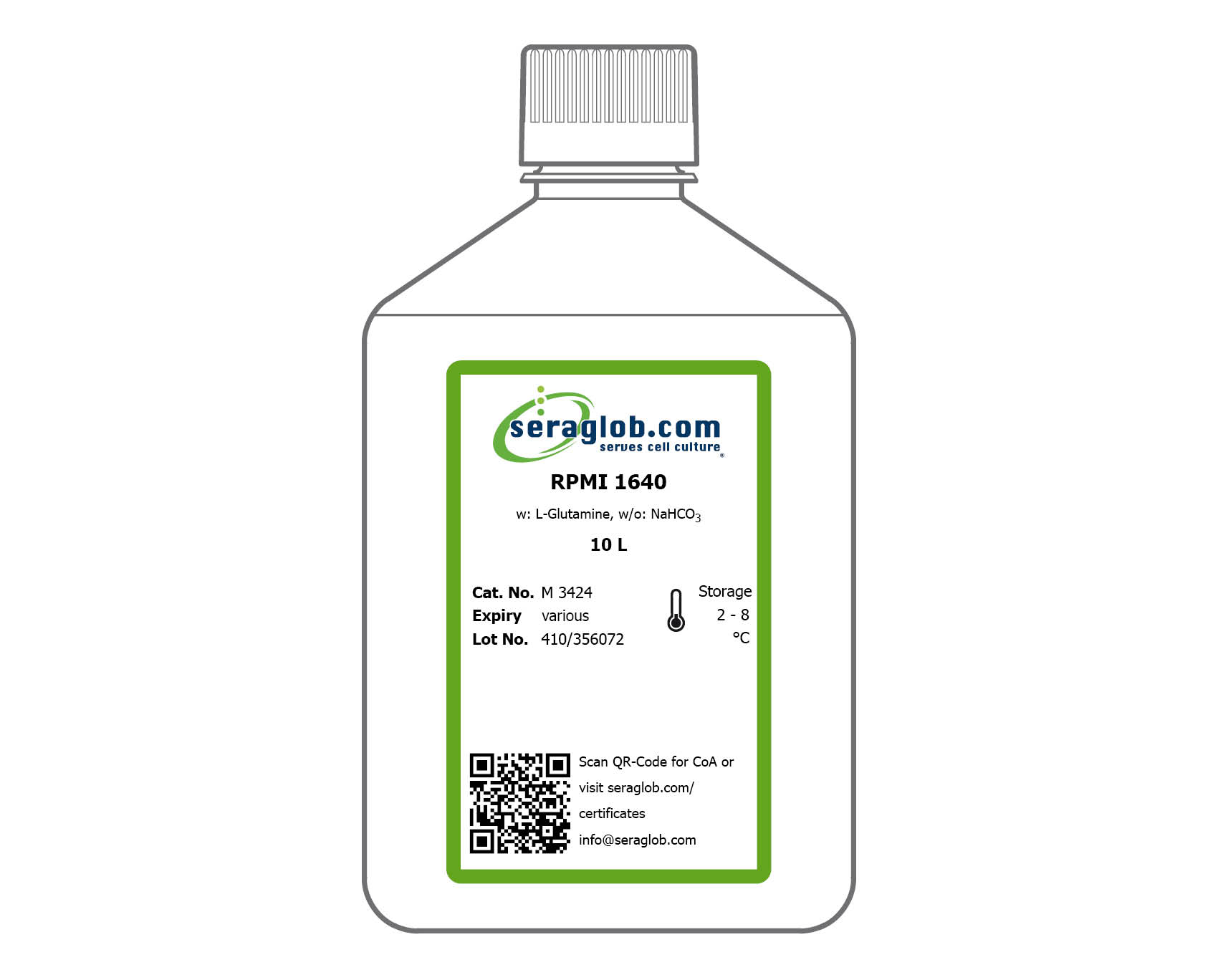 RPMI 1640, w: L-Glutamine, w/o: NaHCO3, 10 L, storage at 2°C – 8°C